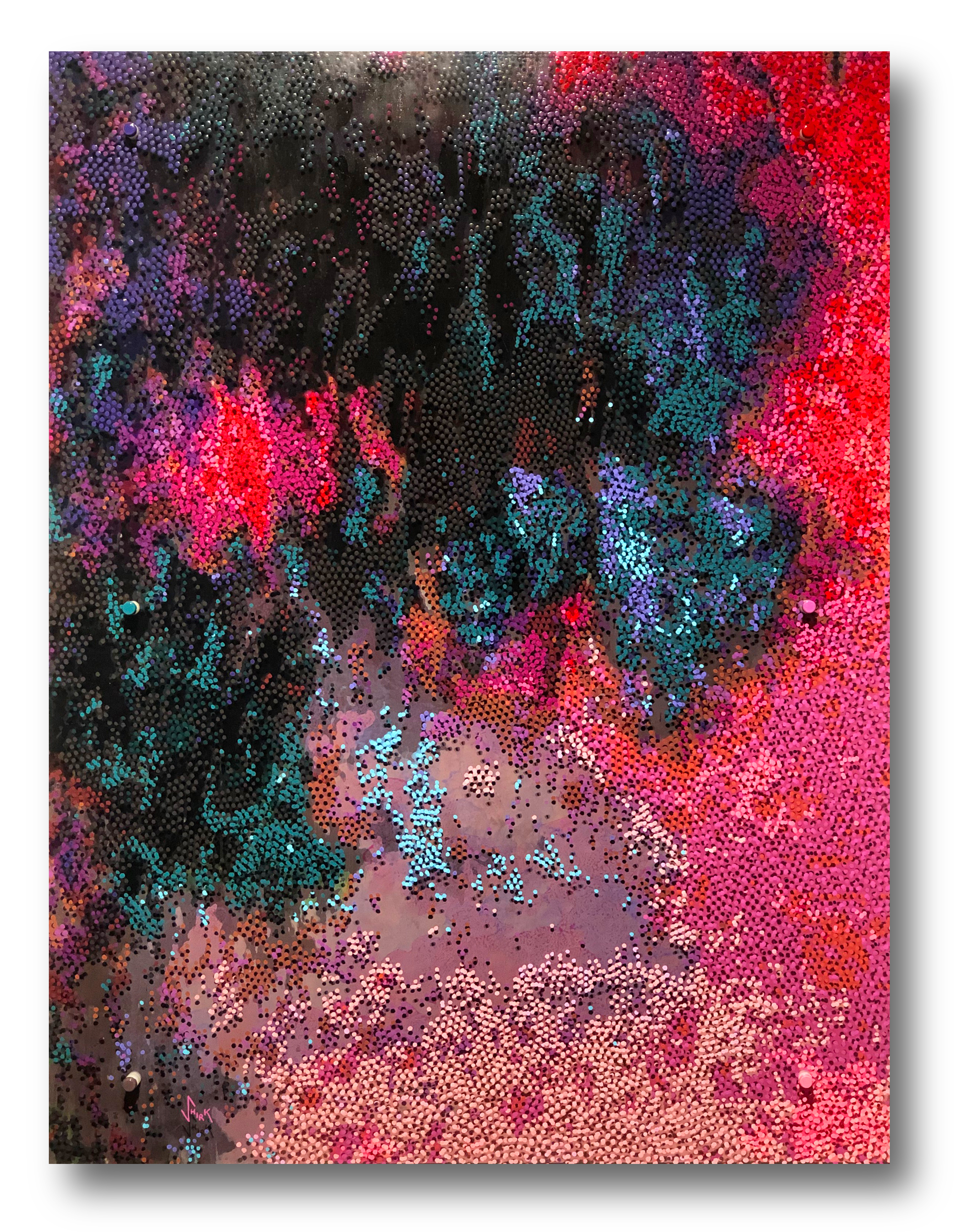 "A vibrant pointillism artwork with a captivating interplay of colors and texture. The viewer's perception might shift depending on the distance and angle from which they view the artwork, a common trait of pointillism. There's a sense of energy and movement in the piece, almost as if the colors are dancing or vibrating. The blending of colors within each dot cluster creates a hazy, dreamlike effect."